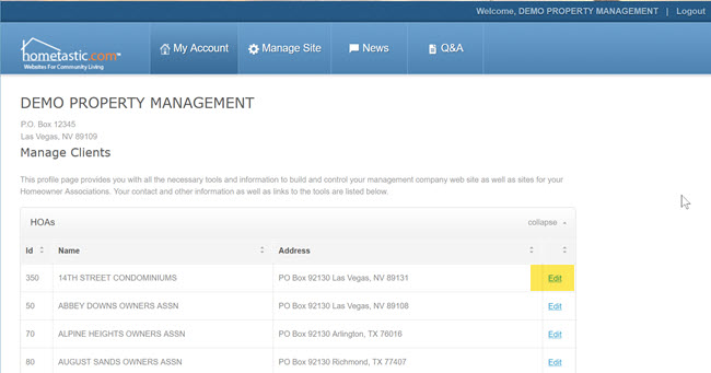 Upon login, the "Manage Clients" webpage will be displayed with a list of all HOA/Clients